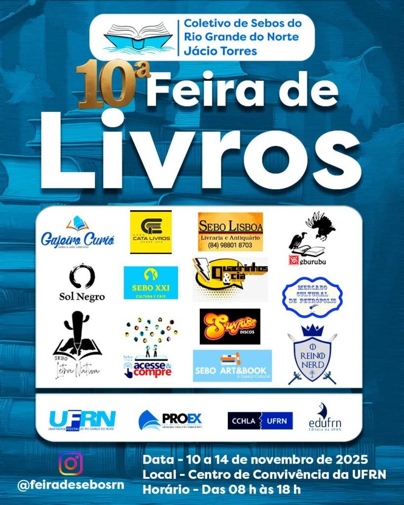 De 10 a 14 de novembro de 2025, o Centro de Convivência Djalma Marinho, no campus central da UFRN, volta a se transformar em um verdadeiro ponto de encontro entre leitores, colecionadores e amantes da cultura com a realização da 10ª Feira de Livros do Coletivo de Sebos do Rio Grande do Norte – Jácio Torres.