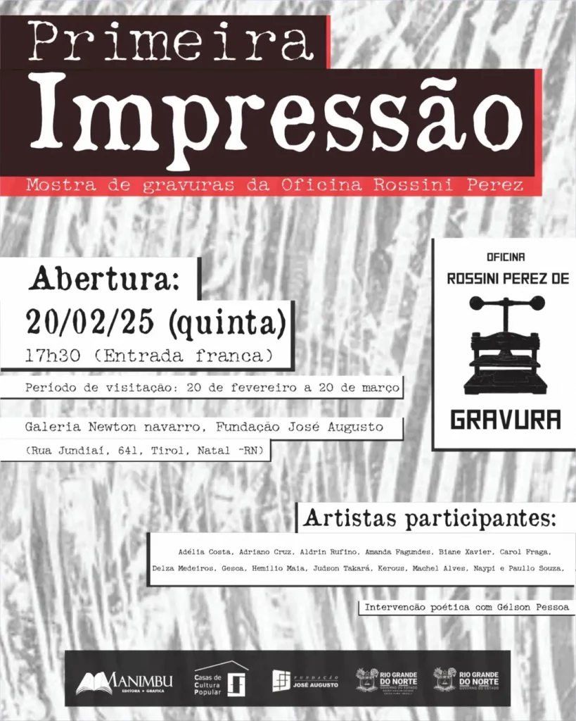Será aberta no dia 20 de fevereiro de 2025 (quinta-feira), às 17h30, a exposição “Primeira Impressão”, na Galeria Newton Navarro. A mostra marca o início da trajetória artística da turma de 2025 da Oficina Rossini Perez de gravura, trazendo ao público os primeiros trabalhos desenvolvidos por 14 artistas em formação. O espaço é situado na […]