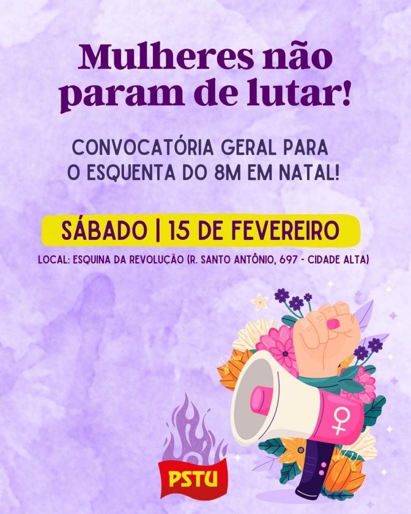 Salve, mulherada!! Nós mulheres do PSTU estamos convocando um esquenta para o 8M em Natal. Mulheres não param de lutar vai ocorrer no próximo sábado (15/2) na esquina da revolução, na sede do PSTU (Rua Santo Antônio, 697, Cidade Alta (Em frente à igreja do Galo). 📢 Será um momento político e cultural de encontro […]