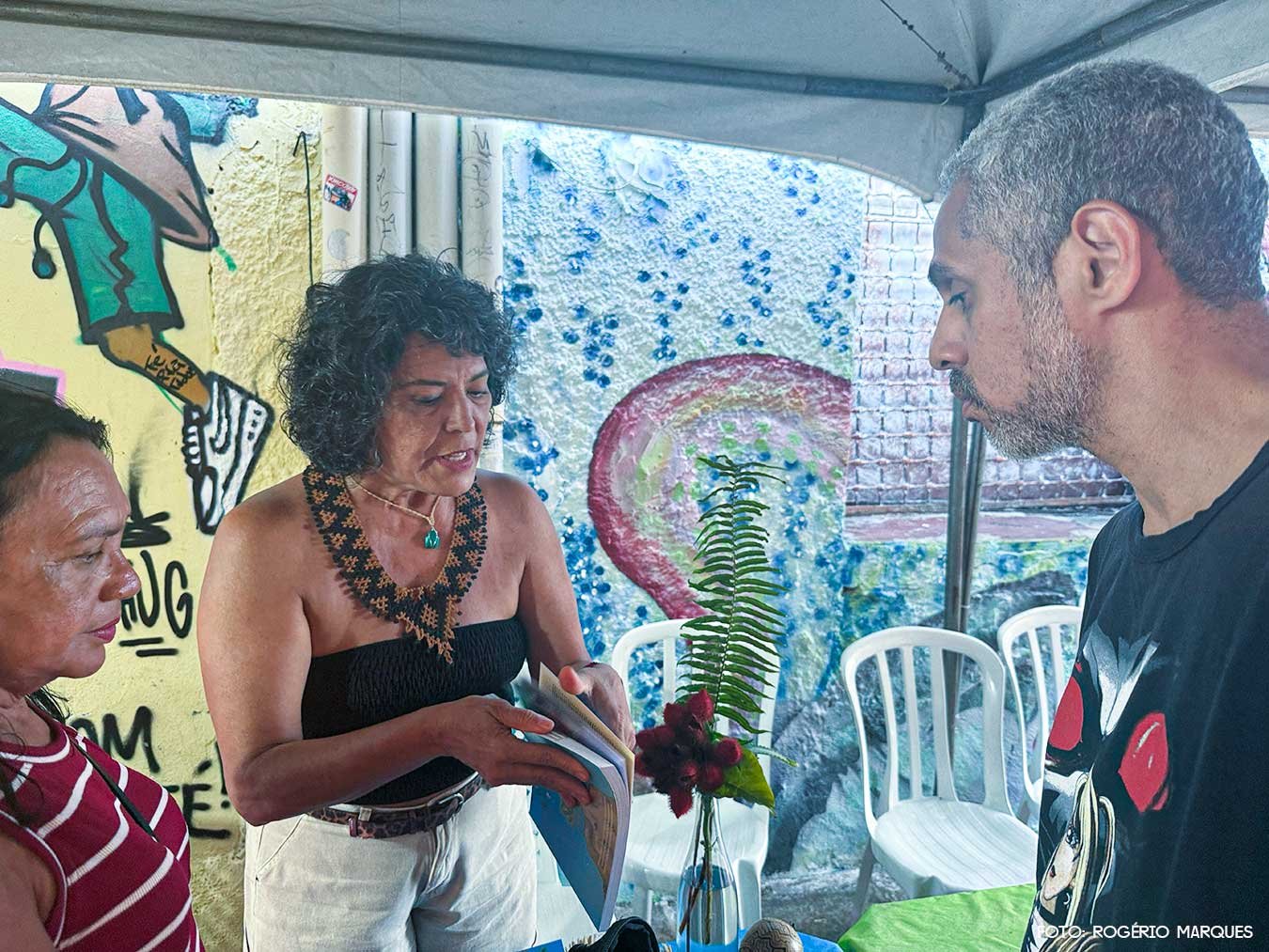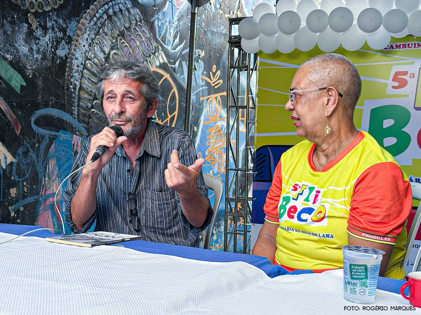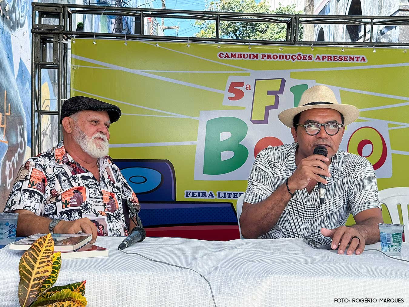 Enquanto o cordel se enturmava com outras linguagens literárias que exibiam o poder da palavra para o público, o historiador e poeta Carlos Magno puxou o fio da memória na roda de conversa sobre Folclore em Movimento, relembrando do mestre do mamulengo Chico Daniel e da maior romanceira do Brasil, Dona Militana, que seguem encantando o imaginário popular.
