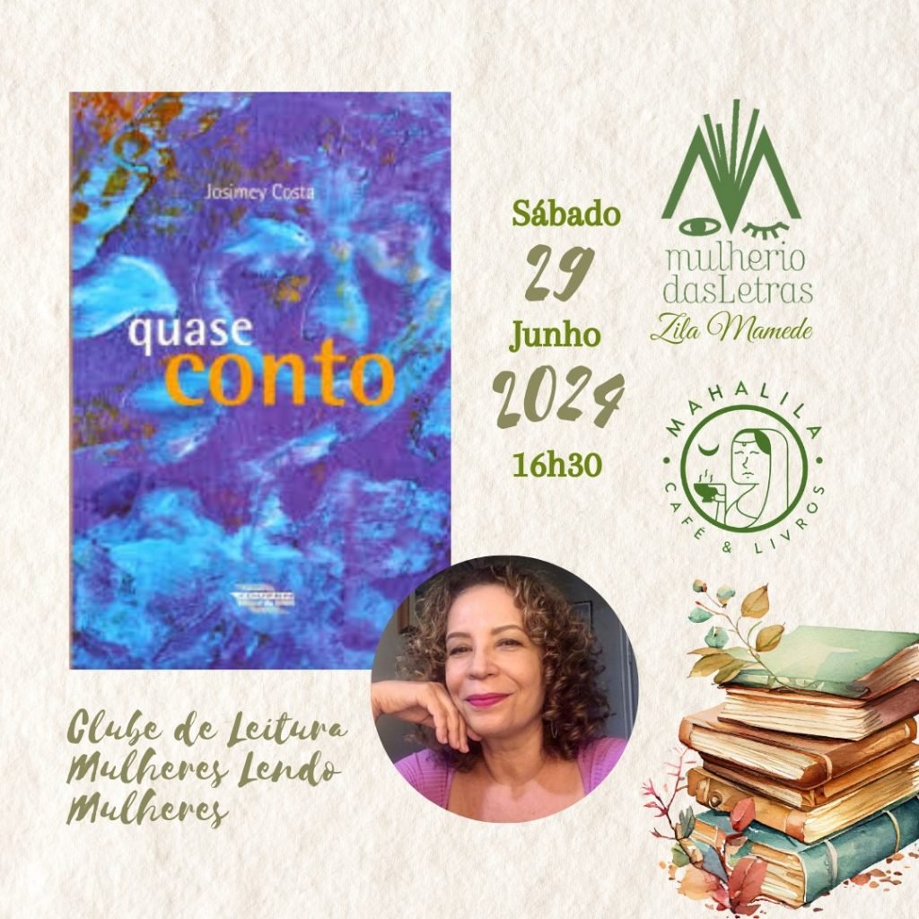 O clube de Leitura Mulheres Lendo Mulheres, organizado pelo Mulherio das Letras Zila Mamede, tem reunião aberta ao público neste sábado, 29 de junho, das 16h30 às 18h30, no Mahalila Café e Livros, em Lagoa Nova, para conversar sobre o livro QUASE CONTO com a presença da autora, JosimeyCosta.